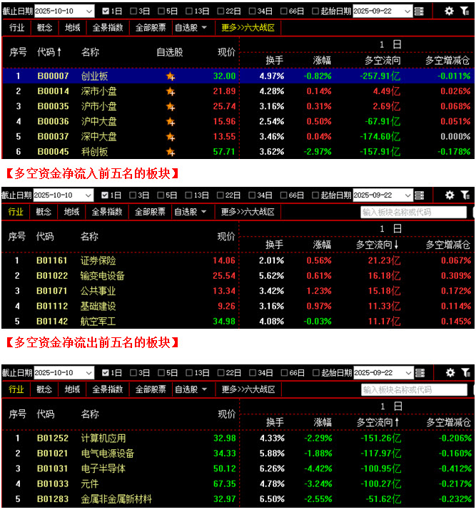 从板块资金动向数据来看,截止到今日收盘时,在资金流入榜上,证券保险板块以21.23亿的资金流入额位居榜首;其次是输变电设备板块,资金流入16.18亿;此外,公共事业板块、基础建设板块、航空军工板块的资金流入额也都相对较多,分列资金流入榜第三到第五名位置;再看资金流出榜,计算机应用板块引领做空,资金流出151.26亿;其次是电气电源设备板块,资金流出117.97亿;此外,电子半导体板块、元件板块、金属非金属新材料板块也都相继上榜,三个板块的资金流出额分别为100.95亿、100.27亿、51.62亿。综合比较后可知,今日不仅计算机应用板块资金流出高达151亿,电气电源设备、电子半导体、元件等板块的资金流出额也都在百亿之上,由于这些板块都是近期的热门板块,且彼此之间具有较强的关联性,所以它们的集体大幅做空导致场内投资者的持股信心出现动摇,恐慌性抛盘随之大量涌出,全天资金流出超过10亿的板块多达16个;反观多方阵营,虽然证券保险板块资金流入超过20亿,同时输变电设备、公共事业、基础建设、航空军工等板块的资金流入额也都在10亿之上,但与空方力量相比,多方力量明显偏弱,故此难以推动大盘形成快速反弹。从六大战区的情况分别来看,截止到今日收盘时,深市小盘战区与沪市小盘战区均为资金流入状态,但两个战区的资金流入额均不足5亿;其余四个战区则均为资金流出,其中不仅深中大盘战区与科创板战区资金流出双双超过150亿,创业板战区的资金流出额更是高达257亿。可见今日空方力量远远强于多方,且抛压主要集中在创业板与科创板,导致近期走势较强的中小盘科技股纷纷回落,场内做多人气快速下降,3900点整数关口也随之失守。在这种情况下,虽然行情在短期内或仍有继续下探的可能,但只要空方无法连续施压,市场调整的幅度就会较为有限。故此建议大家在控制好仓位的同时,密切关注场内多空资金的进出情况,若多方资金很快出现回流,推动大盘重新站上3900点整数关口,则可对后市继续看多做多;反之,如果空方连续施压,导致大盘跌破5日成本均线,那么后市调整幅度很可能会进一步加大,操作上则需以谨慎为主。