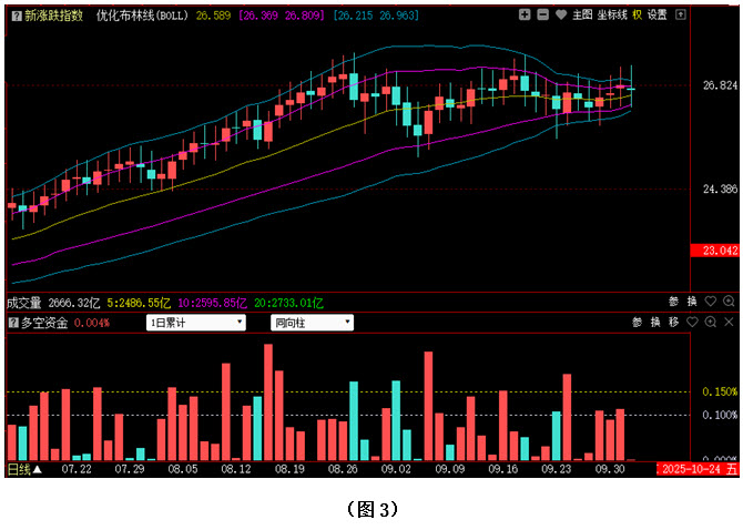 今日两市上涨个股共2774只,其中涨幅超过3%的个股434只,涨幅在9.9%以上的个股67只;下跌个股共2536只,其中跌幅超过3%的个股879只,跌幅在9.9%以上的个股32只。图3所示为指南针特有的0Z指数K线图,从图中可以看到,今日0Z指数窄幅震荡整理,最终收出一颗阴十字星,收盘位置依然处于优化布林中轨上方。可见今日场内多数中小盘个股虽有回落,但市场整体走势并未出现太大变化,目前0Z指数依然处于自8月26日以来的震荡区间内部,随着优化布林敞口的进一步收窄,后市即将会给出方向性选择。从下方的多空资金来看,今日0Z指数的多空资金为流入状态,但资金流入量很小,说明在这种关键时刻,多空双方都在等待着方向的明确。在这种情况下,建议大家密切关注接下来0Z指数的走势变化,如果0Z指数出现一根向上突破的中阳线,后市可继续看多;反之,若0Z指数出现向下的中阴线,市场调整幅度则会有加大的可能,操作上需以谨慎为主。