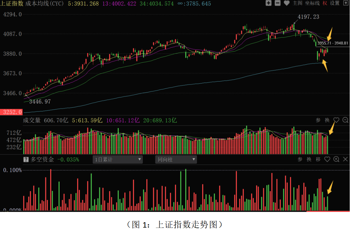 从上证指数来看,昨日股指早盘一度冲高,回补3月23日K线的部分跳空缺口,随后震荡下跌,对前一日K线形成“阴包阳”走势,多空资金净流出157.90亿元,短线走势相对较弱。对于市场的短期调整原因,外部因素上,中东地缘风险没有实质性的缓和,国际油价继续处于高位,市场对全球经济滞胀的担忧没有解除,外部事件的不确定性继续压制资金的风险偏好,对A股情绪面形成承压和持续扰动。内部因素上,市场处于前期大涨后的情绪修复和超跌反弹走势阶段,板块结构上,科技制造、油气化工、消费地产等板块均出现不同程度的超跌反弹轮涨,市场短期超跌反弹动能得到一定程度的释放。由于外部因素对市场做多情绪的压制,成交量持续萎缩,增量资金进场积极性不高,资金追涨意愿不强,在短期板块超跌轮动之后没有新的有号召力的主线机会引领,市场转为震荡调整的走势。同时,近期早评有提醒,3950点—4000点一带是前期平台压力位置,短期对股指运行形成一定的压力,能否有效修复和站上,还需中东局势有明显的好转,以及年报、一季报业绩风险的充分释放,否则股指将围绕3800—4000点进行磨底和筑底。近期市场运行的主要逻辑“外部有扰动、内部有托底”,国内稳经济调结构的政策部署对全年经济稳增长形成支撑,也是市场稳定运行的基础。最新公布3月份制造业PMI数据为50.4%,重回扩张区间,确认经济温和复苏,改善企业盈利预期。短期由于市场上焦点在美联储鹰派的货币政策、中东局势等外部因素上,制造业PMI数据被短期情绪压制。隔夜美国股市强势反弹,油价有所回落,对今日A股走势形成正面影响,短期调整后有望企稳震荡,调整幅度较大的科技股或有反弹的空间。同时,上市公司年报、一季报即将密集披露,部分高估值科技成长股短线仍有上行压力。后续如果中东局势缓和,政策逐步发力,PMI数据继续持续扩张,会加速阶段底部的形成,为行情继续向上修复提供动力,科技制造、顺周期等方向机会会增加。从0Z指数走势来看,股指冲高回落明显下跌,70个板块中仅4个板块上涨,全市场下跌个股家数和上涨个股家数比超4:1,多空资金净流出302.72亿元,市场赚钱效应明显降低。目前活跃市值走势较弱,成本均线处于空头排列状态,并且创出阶段新低,资金活跃度明显降低,叠加清明假期临近,短期走势将以弱势震荡为主。近期轮动反弹个股二次震荡后,会有低吸机会。目前操作上应继续保持定力,采取稳健策略应对,总仓位控制在5成左右,底仓持股为主;浮动仓位不宜激进追涨,短线品种应根据关键位置资金流向和短线决策信号做好仓位调整,小仓位适当参与超跌反弹机会。